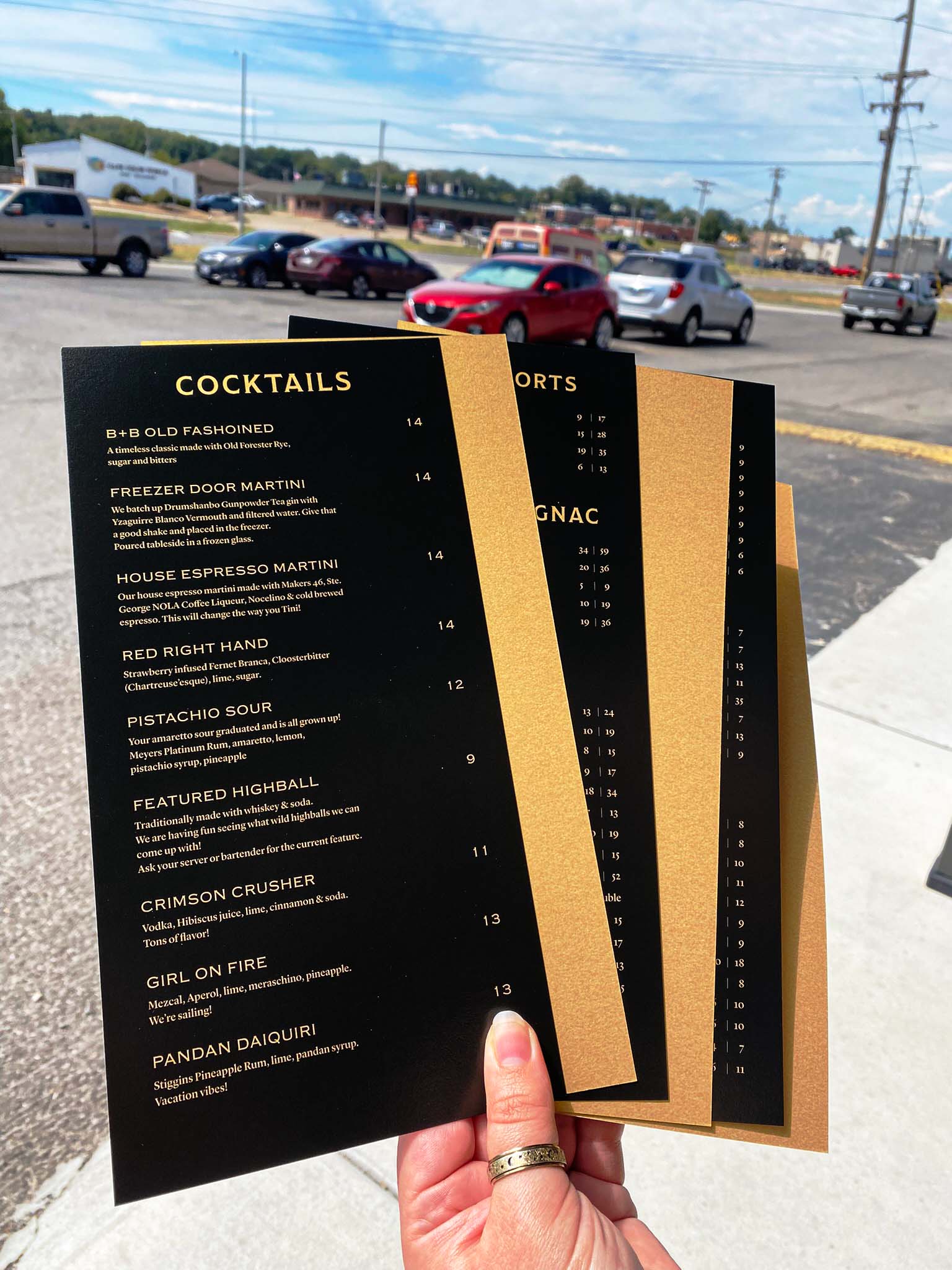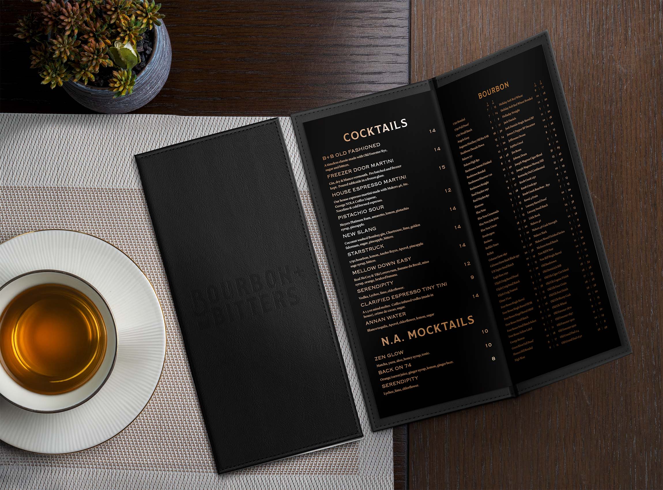 I had the unique opportunity to meet personally with the owner of Bourbon + Bitters before doing their menus. We used their existing menu as a starting point, but I saw an opportunity to take it to the next level and use some specialty paper we'd been experimenting with. Next time your're in Bourbon + Bitters take note of the shimmering metalic gold while you're admiring the typesetting.