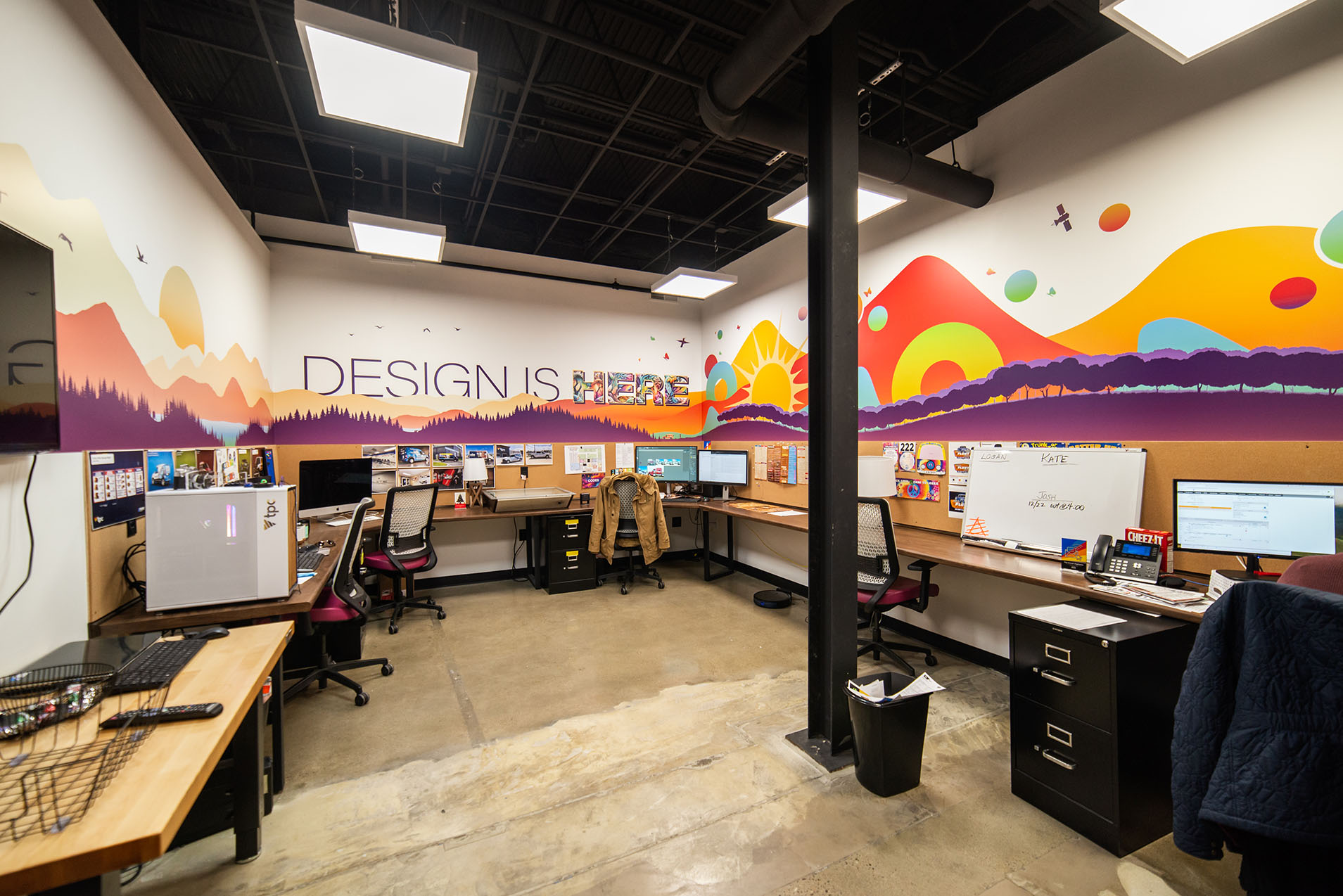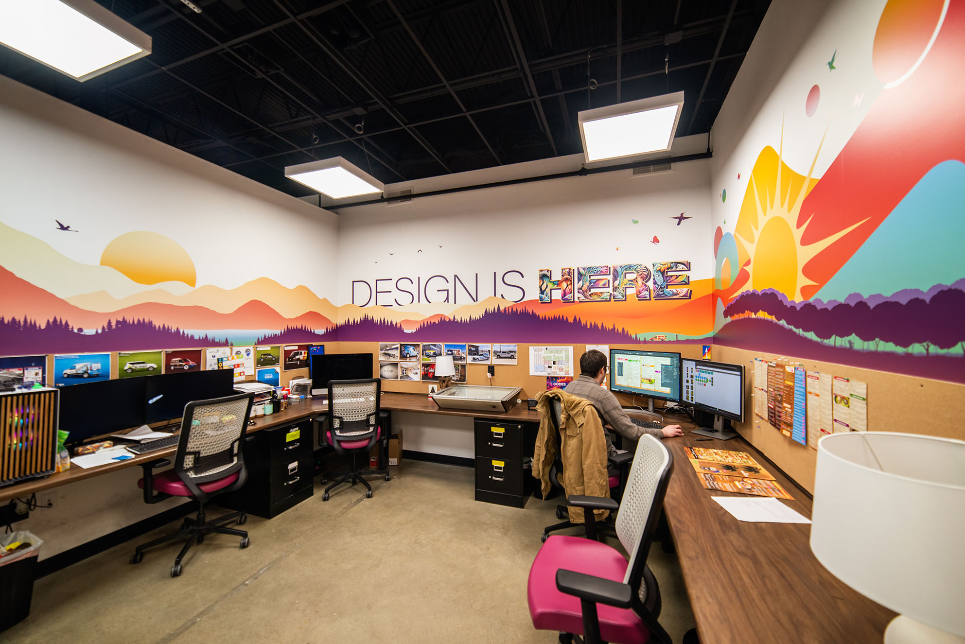 The TPC creative team was in need of wall decorations ahead of our 2023 open house. The three of us each contributed something to this unique wall wrap. I pitched the idea of a three wall landscape, and Kate contributed the copy- referencing the "Design is Everywhere" graphic we have in our lobby. Josh started the landscape with the vibrant color scheme and surealism on the right wall and stopped at the corner. I designed the other two walls and the type, joined our work together, set the job up for production, and installed it.
