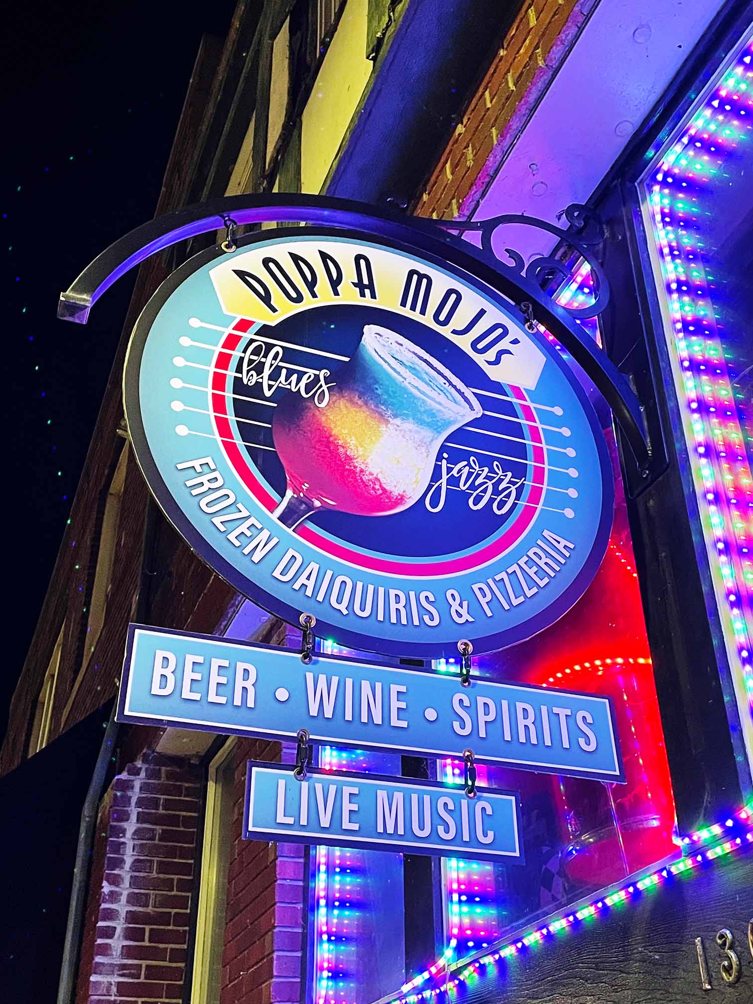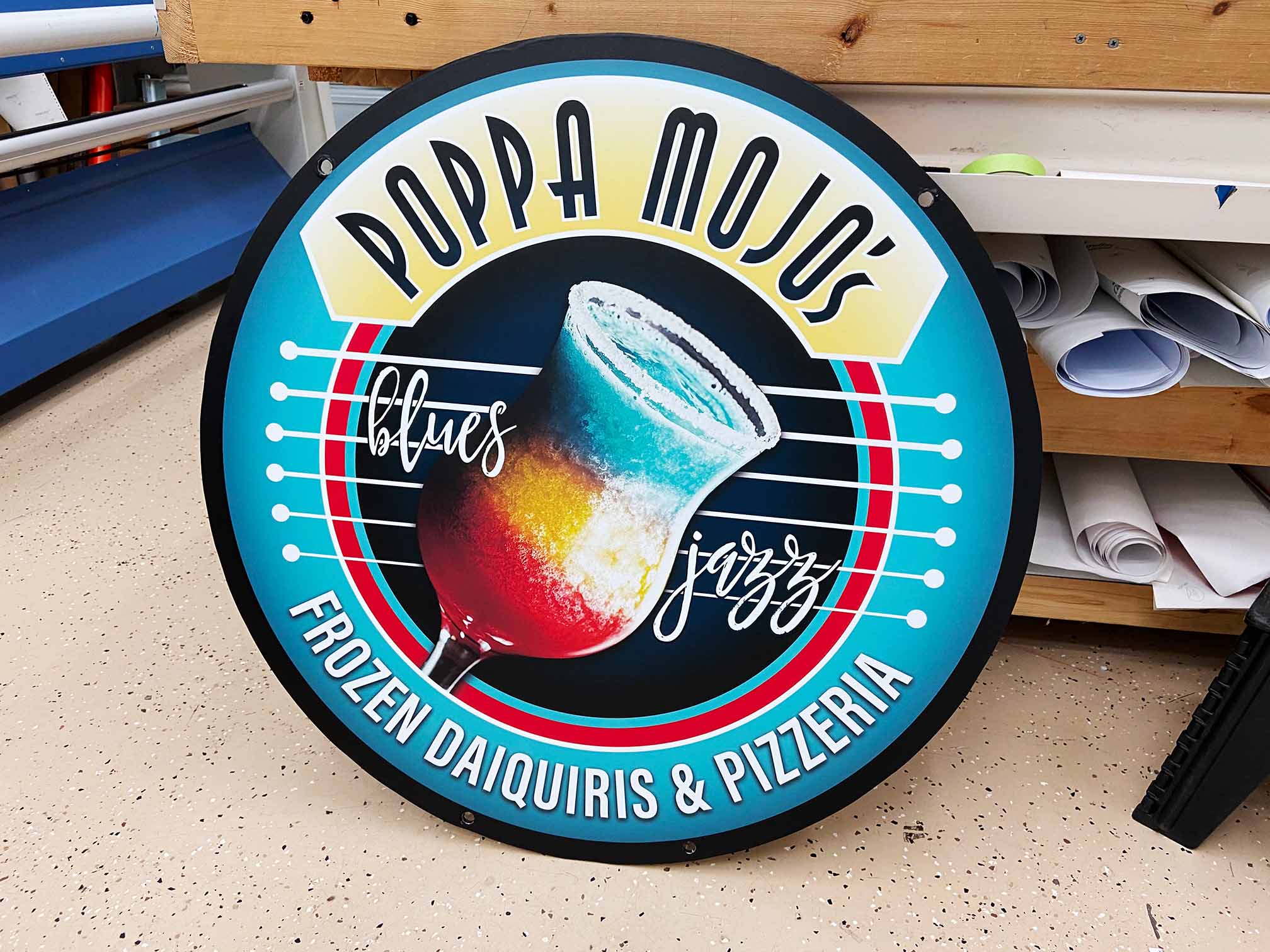 The vision for Poppa Mojo's was a classy jazz and blues daiquiri bar. I was tasked with creating a sign to capture this vision.
