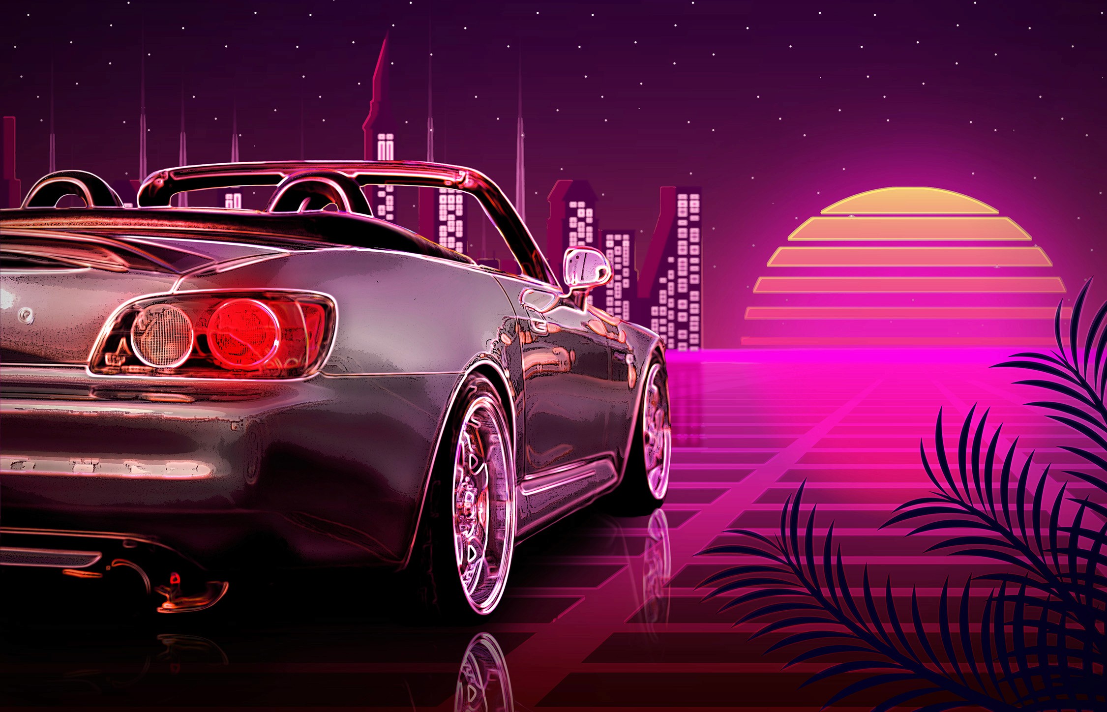 This was a project I did as a secret santa gift for a coworker. I sourced a photograph of his car and did a fun synthwave edit.