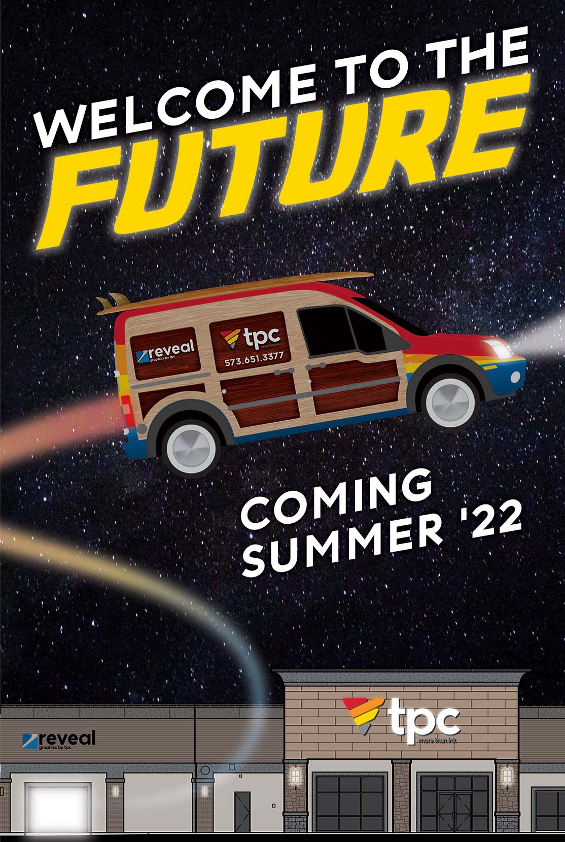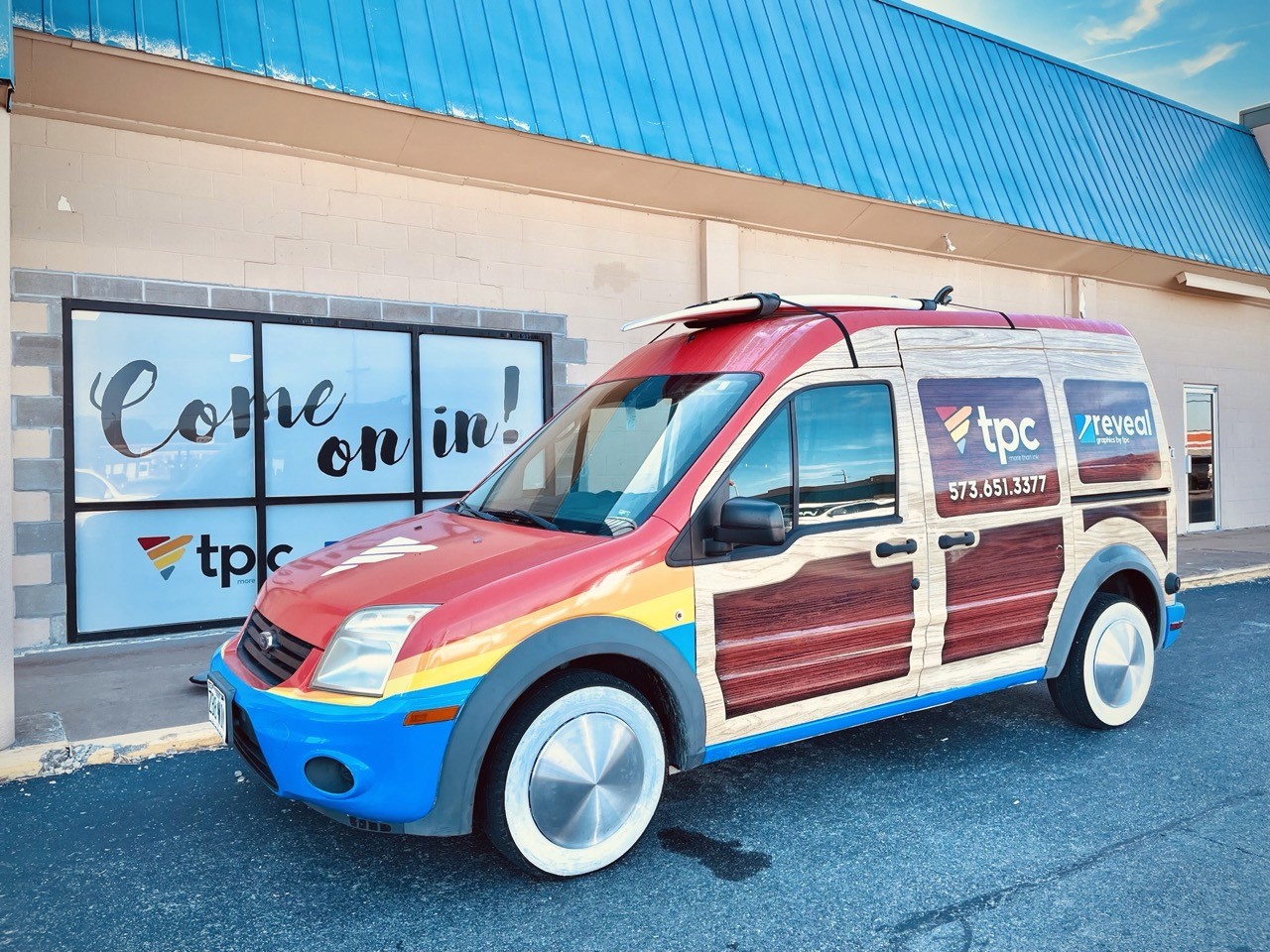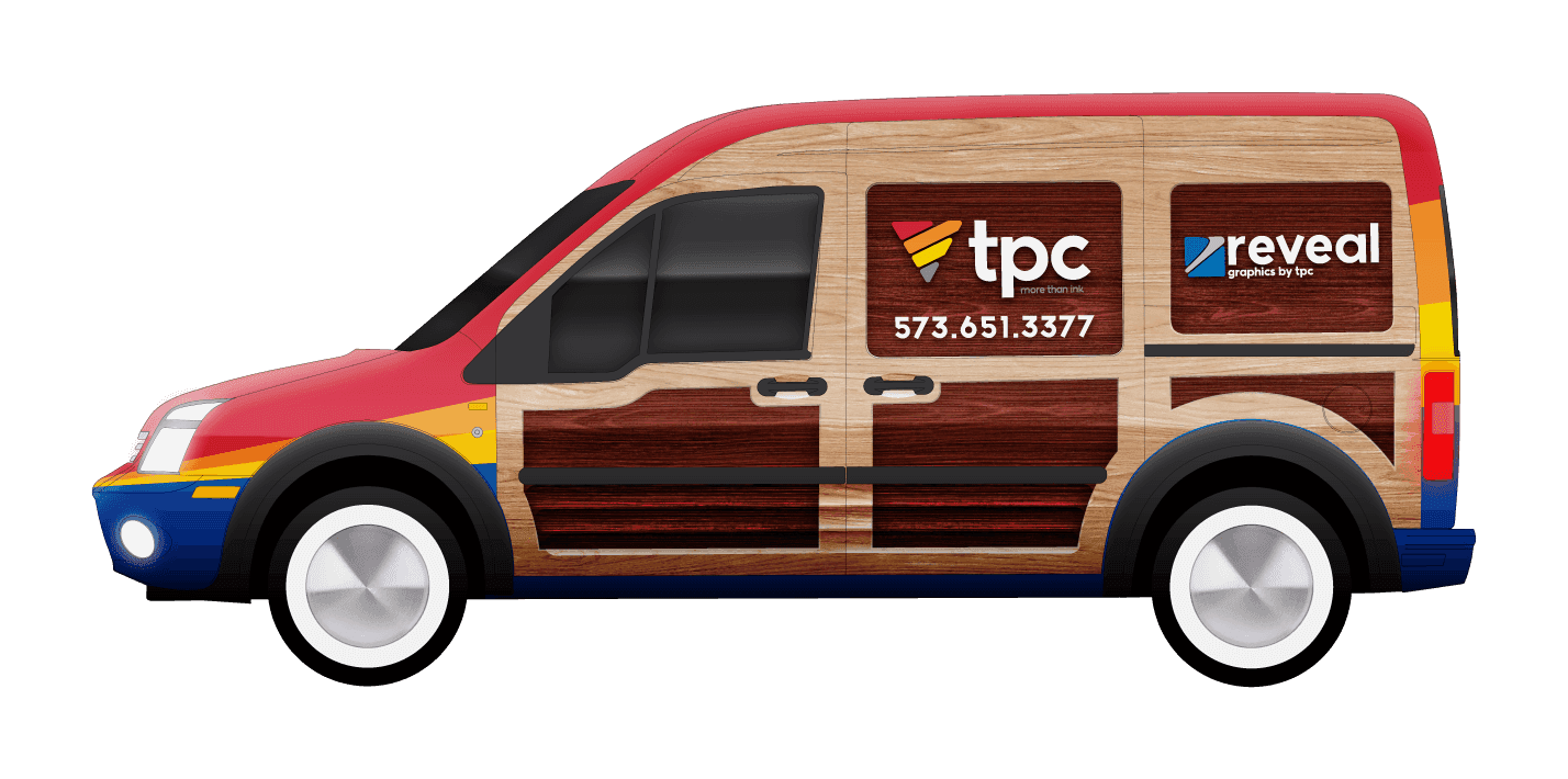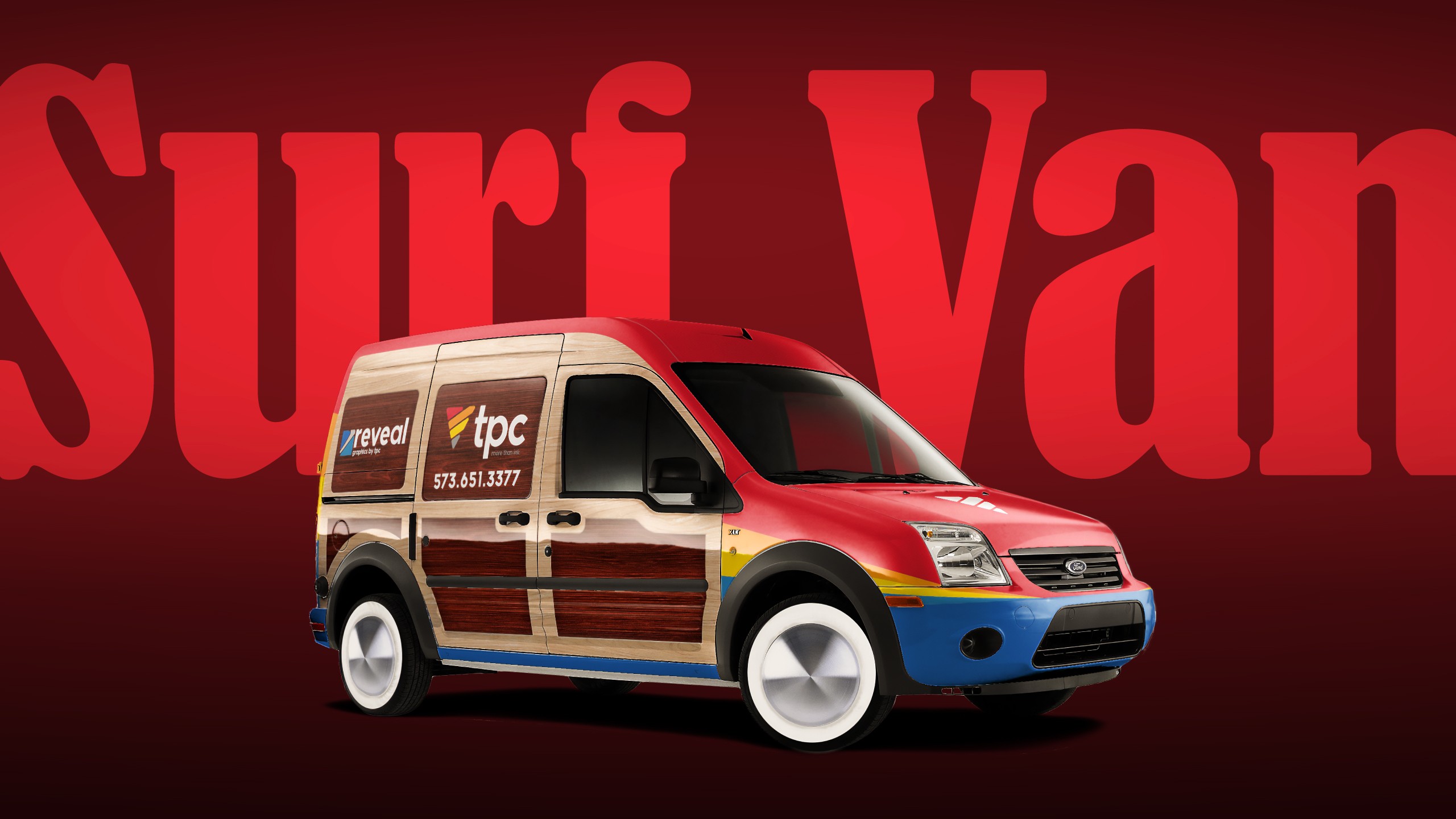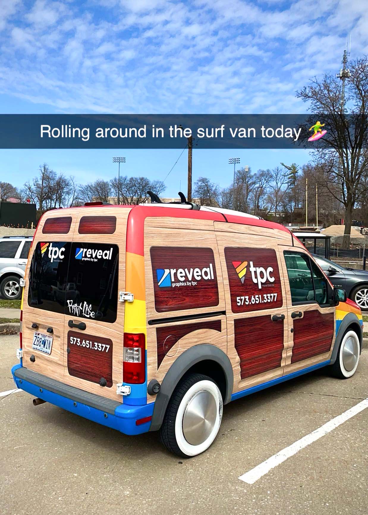 The surf van is used by our large format graphics department for installs and site visits. For several months we kept an actual surf board strapped the the top of the van until the straps tragically failed on the highway. The surf van has been a real crowd-pleaser over the last couple years and really turns heads on the roads of Southeast Missouri.
