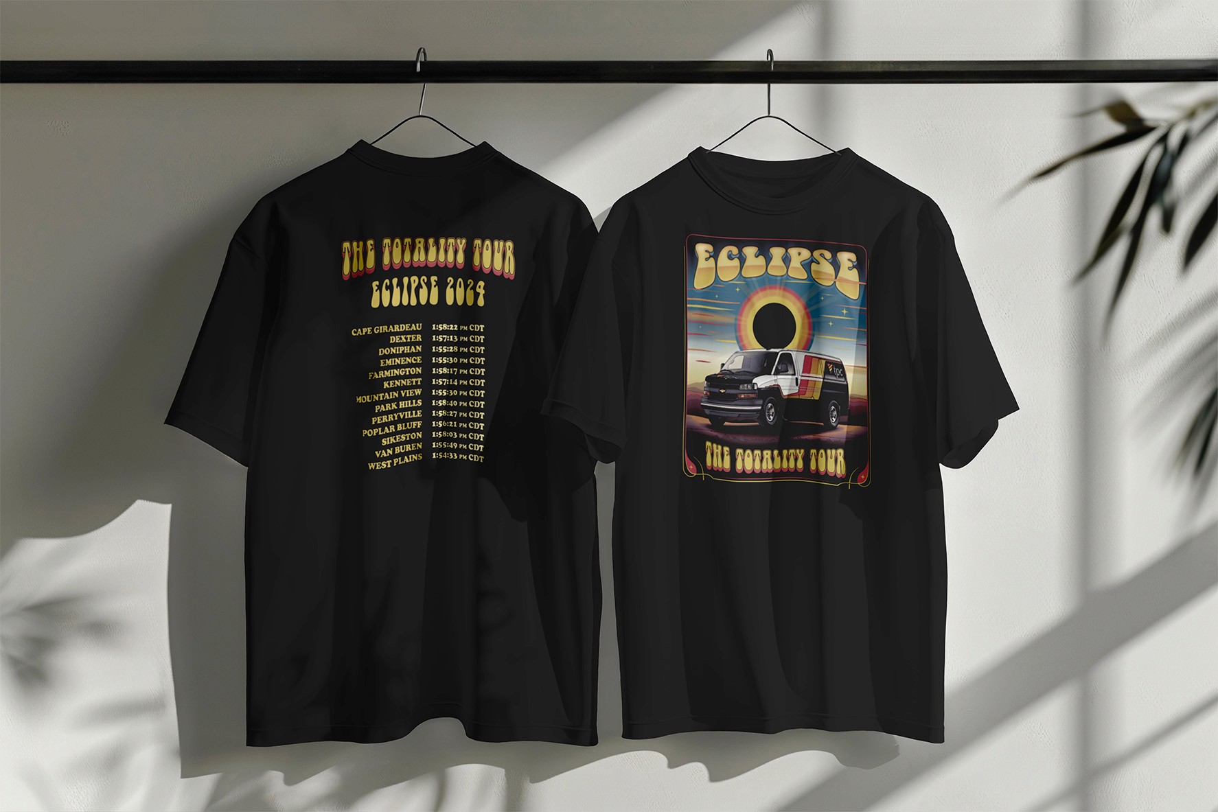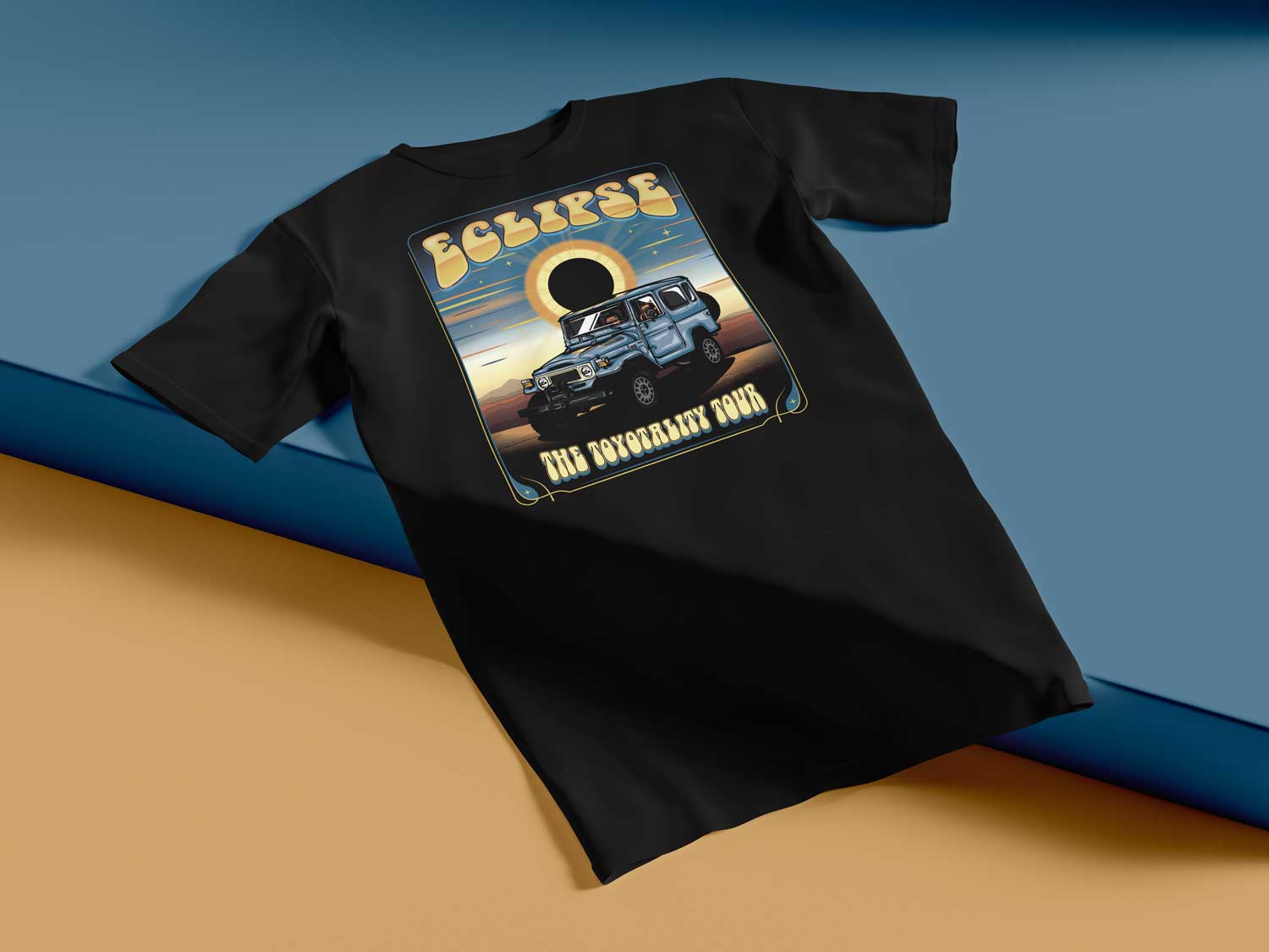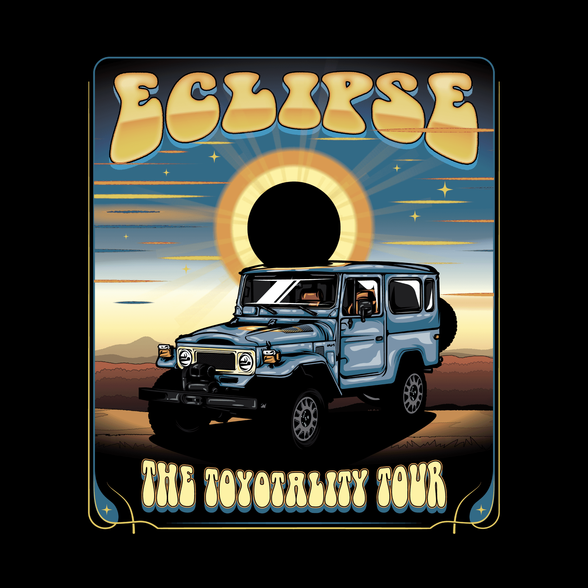 I designed some special screen printed t-shirts for TPC in preparation for the total solar eclipse of 2024. They resembled retro band Ts and featured our 70s style delivery van. The shirts were a huge success, and when Coad Toyota saw the them, they immediately wanted their own. So I adjusted the design for them with a unique color scheme and a classic Toyota Land Cruiser illustration I sourced. To this day, people wear these eclipse shirts on a daily basis at the TPC office.