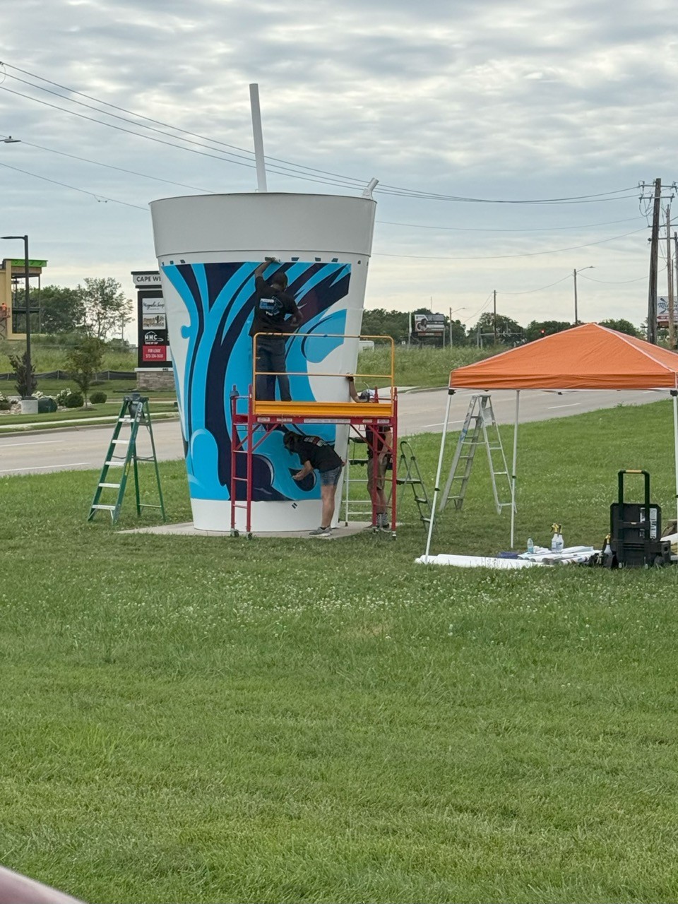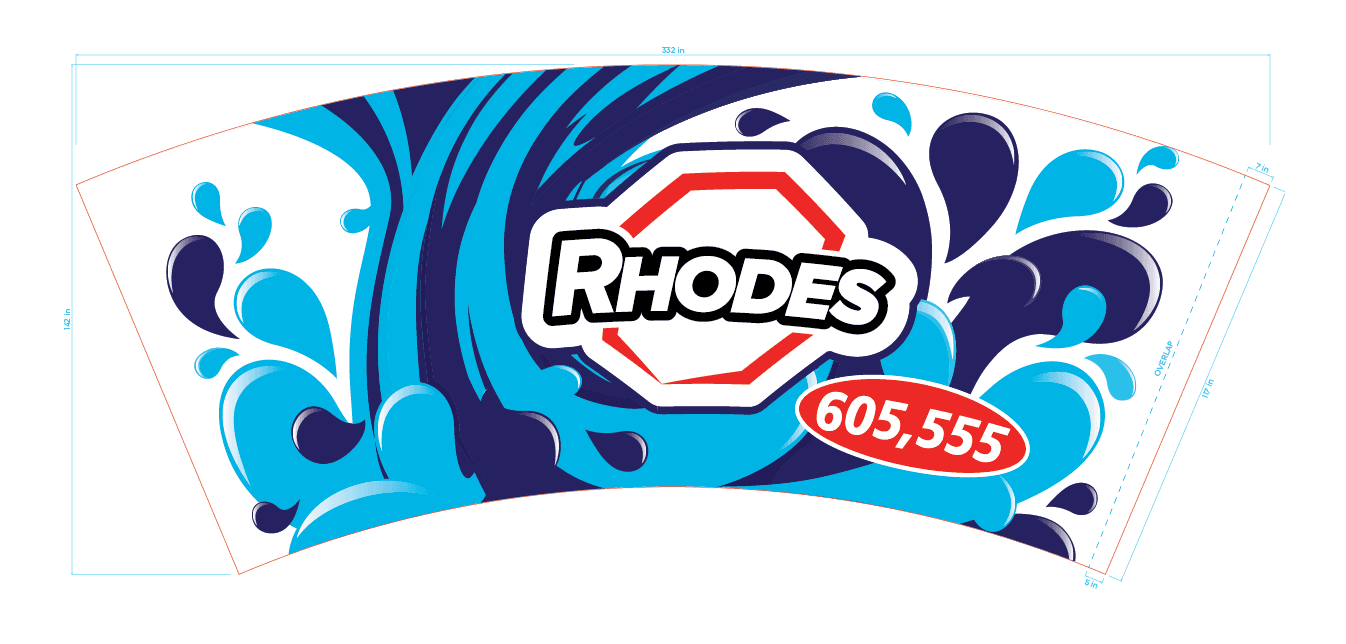 This project involved taking the artwork from Rhodes Convenience Stores' fountain drink cups, modifying it, and setting it up to wrap the refurbished World's Largest Fountain Drink. The cup had weathered over the years since its initial completion, and we were tasked to assist with its renewal. I made changes to the artwork at the clients request, and converted it from a flat design to print-ready files for our production team to produce and install. This was one of the biggest and most complex vinyl projects I've ever been involved with.
